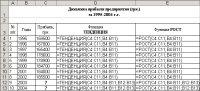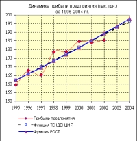 Воспользуемся рабочей таблицей задачи 1 (см. рис. 4). Начнем с функции ТЕНДЕНЦИЯ: выделяем диапазон ячеек D4: D11, который следует заполнить значениями функции ТЕНДЕНЦИЯ, соответствующими известным данным о прибыли предприятия; вызываем команду Функция из меню Вставка. В появившемся диалоговом окне Мастер функций выделяем функцию ТЕНДЕНЦИЯ из категории Статистические, после чего щелкаем по кнопке ОК. Эту же операцию можно осуществить нажатием кнопки (Вставка функции) стандартной панели инструментов. В появившемся диалоговом окне Аргументы функции вводим в поле Известные_значения_y диапазон ячеек C4: C11; в поле Известные_значения_х - диапазон ячеек B4: B11; чтобы вводимая формула стала формулой массива, используем комбинацию клавиш + +. Введенная нами формула в строке формул будет иметь вид: ={ТЕНДЕНЦИЯ(C4: C11; B4: B11)}.