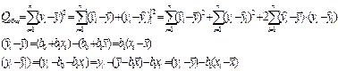 После того, как регрессионная модель построена, то есть найдены ее параметры, необходимо проверить ее адекватность исходным данным, а также полученную точность. При соблюдении всех предпосылок регрессионного анализа можно проверить значимость уравнения регрессии, для чего следует проверить нулевую гипотезу H0 : β 1=0 В основе проверки гипотезы H0 : β 1=0лежит идея дисперсионного анализа, состоящая в разложении дисперсии на составляющие. В регрессионном анализе общая сумма квадратов отклонений зависимой переменной Qобщразлагается на • сумму квадратов QR отклонений, обусловленных регрессией, которая характеризует воздействие объясняющей переменной, • сумму квадратов Qост отклонений относительно плоскости регрессии, характеризующую воздействие неучтенных в модели или случайных факторов. Qобщ=QR + Qост где