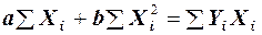 В системе уравнений (4) все суммы берутся по i в пределах от 1 до n. Система (4) называется системой нормальных уравнений и ее решение для определения неизвестных a и b имеет вид: