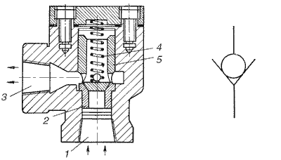 Рис.6.7. Блокировочное устройство Блокировочное устройство имеет подпружиненные шарики 1, которые при разъединении трубопроводов блокируют поток. При соединении труб путем навинчивания гайки 2 на штуцер 4 толкатель 3 отжимает шарики от их седел, позволяя жидкости свободно проходить через устройство. В гидроприводе обратные клапаны применяют: как подпорные; для создания нерегулируемого противодавления в сливной магистрали гидродвигателя; для блокировки вертикально расположенного поршня от самопроизвольного опускания при выключенном приводе; для неуправляемого пропуска рабочей жидкости в одном направлении и управляемого в другом (совместно с дросселем); для исключения утечек жидкости из гидросистемы при демонтаже и т.д. Как конструктивный элемент обратный клапан включен в конструкцию разделительных панелей, напорных клапанов, дросселей и регуляторов потока, в золотники с гидравлическим управлением, в насосы и гидравлические двигатели, в гидрозамки и т.д.