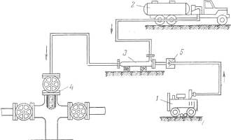 Рис.3.5 Схема обвязки оборудования при обработке скважин пенами. 1-компрессор; 2 - кислотный агрегат; 3 - аэратор; 4 — крестовина; 5 — обратный клапан