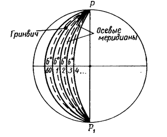 Рис. 35 В поперечно-цилиндрической проекции искажения будут в длинах линий: зоны на цилиндре получаются более широкими, чем на шаре. Не будет никаких искажений осевого меридиана – он касается поверхности цилиндра, но чем дальше расположены отрезки от осевого меридиана, тем больше искажений в длинах линий. Ширина зоны на экваторе около 670 км, т.е. крайние точки зоны удалены от осевого меридиана примерно на 335 км. Искажения в длинах линий на экваторе достигают: при удалении от осевого меридиана на 100 км –