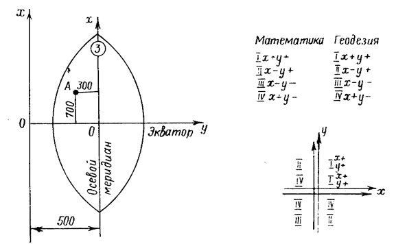 Наличие искажений в общем случае определяет возможное непостоянство масштаба в отдельных частях карты, и поэтому существуют понятия главного масштаба и частных масштабов. Главный – масштаб того глобуса, который изображают при составлении карты, частные масштабы относятся к различным частям карты. Система географических координат удобна для изучения всей физической поверхности Земли или значительных ее участков, но неудобна для решения многих инженерных задач. Проекция Гаусса в географическом отношении не имеет практического значения, так как дает изображение земной поверхности с разрывами. Но ее ценность в том, что она в силу малых искажений сближает карту с планом и позволяет назначать систему плоских прямоугольных координат в каждой зоне, что удобно при решении инженерных задач. В проекции Гаусса за начало координат в каждой зоне принимают точку пересечения осевого меридиана с линией экватора, которые образуют прямой угол. Они и есть в данном случае оси координат (рис. 38). Осевой меридиан служит осью абсцисс x, а линия экватора – осью ординат у. Положительным направлением абсцисс считается направление от экватора к северу, положительным направлением ординат – на восток. В математике применяется левая система координат (нумерация четвертей против движения часовой стрелки), в геодезии – правая система. Но так как наименования осей координат тоже противоположны, знаки координат точек, расположенных в одноименных четвертях, совпадают (см. рис. 38), что позволяет применять формулы тригонометрии без всяких изменений и в данной системе.