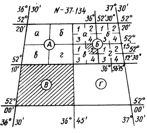 Разграфка листов карты масштаба 1: 500 000 производится путем деления средним меридианом и средней параллелью листа карты масштаба 1: 1 000 000 на четыре части, которые обозначаются прописными буквами русского алфавита. Номенклатура листов карты масштаба 1: 500 000 складывается из номенклатуры листа карты масштаба 1: 1 000 000, частью которого он является, и соответствующей буквы. Разграфка листов карт масштабов 1: 200 000 и 1: 100 000 производится путем деления каждого листа карты масштаба 1: 1 000 000 меридианами и параллелями соответственно на 36 и 144 части (рис. 47). Листы карт масштаба 1: 200 000 нумеруются римскими цифрами, масштаба 1: 100 000 – арабскими цифрами по рядам с запада на восток. Номенклатура листов карт указанных масштабов состоит из номенклатуры соответствующего миллионного листа и собственного номера, который у листов карт масштабов 1: 200 000 и 1: 100 000 указывается справа от номенклатуры миллионного листа. Например, листы карт масштабов 1: 200 000 и 1: 100 000 (заштрихованные на рис. 47), имеют номенклатуры соответственно N -37-VI и N -37-134. Листы карты масштаба 1: 50 000 получают путем деления листов карты масштаба 1: 100 000 на четыре части (см. рис. 47), обозначаемые прописными буквами русского алфавита. Размеры листа по широте составляют 10¢, по долготе – 15¢. Номенклатура этих листов образуется путем присоединения к номенклатуре листа масштаба 1: 100 000 соответствующей буквы, например N-37-134-Б.