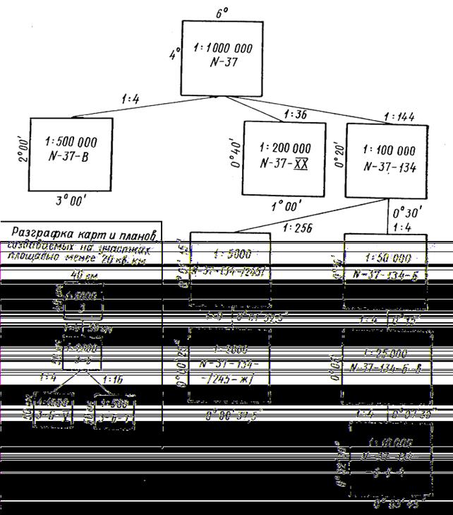 Топографические съемки в крупных масштабах на участках площадью менее 20 км2 выполняются в частных системах прямоугольных координат, не связанных с географической системой. Разграфка листов планов в этих случаях производится не меридианами и параллелями, а линиями координатной сетки. Листы имеют форму квадратов с размерами 40 ´ 40 см для планов масштаба 1: 5000 и 50 ´ 50 см для планов масштабов 1: 2000 – 1: 500. За основу разграфки принимается лист плана масштаба 1: 5000, обозначаемый арабскими цифрами. Листу плана масштаба 1: 5000 соответствуют 4 листа в масштабе 1: 2000, обозначаемые прописными буквами русского алфавита. Лист плана в масштабе 1: 2000 делится на 4 листа планов масштаба 1: 1000, обозначаемых римскими цифрами (рис. 49, а), и 16 листов планов масштаба 1: 500, обозначаемых арабскими цифрами (рис. 49, б). Так, заштрихованный на рис. 49, а лист Г масштаба 1: 2000 будет иметь номер 1-Г. Там же – лист масштаба 1: 1000, заштрихованный двойной штриховкой и обозначенный римской цифрой I, имеет номер 1 - Г - I. Номер листа карты масштаба 1: 500, заштрихованного на рис. 49, б, – 1 - Г - 6. На рис. 50 представлена общая схема разграфки и номенклатур топографических карт, принятая в РФ. Возможны также другие системы обозначения планов крупного масштаба при выполнении съемок объектов строительства. В этих случаях за рамками листов планов указываются принятые схемы их разграфки и нумерации.