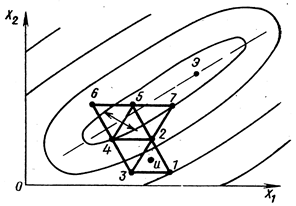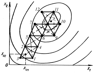 Рис.2.2.2. Относительно какого-либо центра эксперимента строим симплекс, в вершинах которого ставим исходную серию опытов 1, 2, 3. Анализируем полученные результаты и отбрасываем точку с наихудшим значением параметра оптимизации, например, точку 3.Строим её зеркальное отображение и ставим опыт в новой точке, например в точке 4. Вновь анализируем результаты опытов уже в точках 1, 2, 4 с учетом нового опыта. Опять отбрасываем точку с наихудшим результатом и т.д. Процедура поиска повторяется до тех пор, пока не приблизимся к оптимальному решению, например, в точке 8. Для построения исходного симплекса используется матрица, которая имеет вид таблицы 2.2.1. Элементы матрицы определяют по формулам: