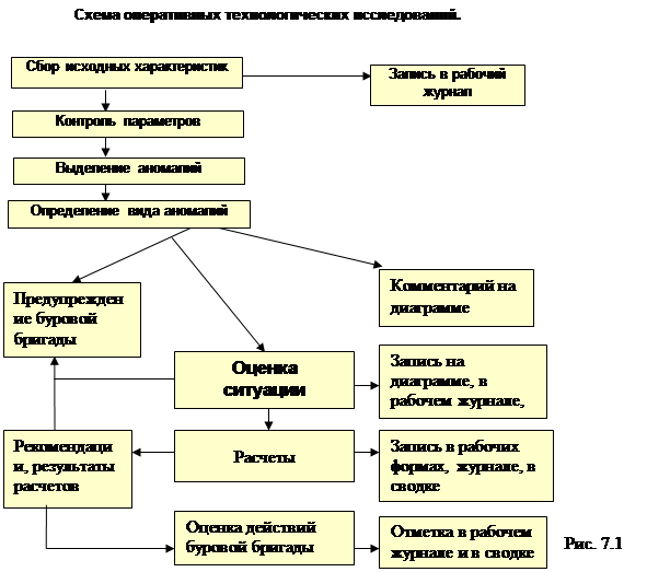Требования к проведению работ изложены в “Технической инструкции по проведению геолого-технологических исследований нефтяных и газовых скважин” (РД 153-39.0-069-01) Основной задачей оператора-технолога является получение достоверной информации о процессе бурения с целью предупреждения аварий и осложнений. К аварийным ситуациям относятся: выбросы пластового флюида, катастрофическое поглощение бурового раствора и гидроразрывы пласта, прихваты, сломы, обрывы бурильного инструмента. К нежелательным ситуациям относятся всевозможные нарушения технологического процесса бурения и нерациональная отработка долот. Работа оператора заключается в измерении и регистрации параметров, выделении аномалий параметров – выдаче предупреждений бурильщику, оценке ситуации – выдаче рекомендаций и соответствующем оформлении материалов Рис. 7.1