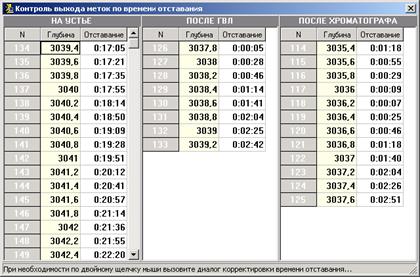 · После постановки на забой и начала бурения необходимо проверить привязку данных к глубине с учетом времени отставания. Для этого в пункте меню ДАННЫЕ Открыть окно “Контроль выхода меток по времени отставания” (Рис.7.7) и проверить наличие в списках меток глубин и времени отставания.