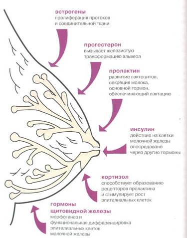 Молочная железа начинает интенсивно развиваться в возрасте 12—16 лет, когда усиливается функциональная активность коры надпочечников и половых желез. В репродуктивном периоде все процессы, связанные с ростом и развитием молочных желез (маммогенез), являются гормонально обусловленными (Ли Л. А., МартынюкВ.А., 1998). Основными гор-1 монами, оказывающими действие на молочную железу, являются стероидные гормоны яичников (эстрогены и прогестерон). В маммогенезе участвуют также гормоны гипофиза, щи-] товидной железы, надпочечников и другие биологически активные соединения (рис. 2.15). Функционирование молочных