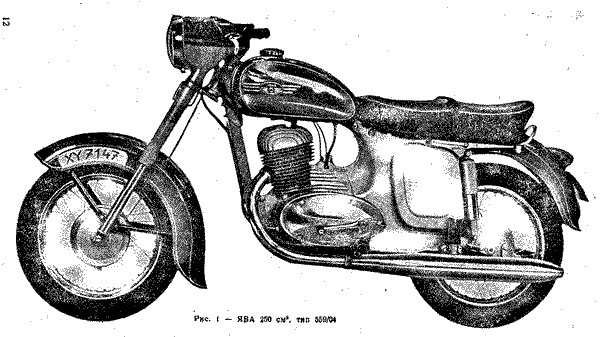 1. ЯВА 250 см3, тип 559/04 2. Двигатель в разрезе — 350 см5 3. Двигатель в разрезе — 250 см5 4. Открывание ящиков 5. Выключатель «Стоп-сигнала> 6. Схема электрического подключения — 250 см5 7. Схема электрического подключения — 350 см3 8. Положения рычажка топливного крана 10. Положения воздушного клапана карбюратора 11. План смазки — левая сторона 12. План смазки — правая сторона s 13. Контрольное и заправочное отверстие масла 14. Слив масла из коробки передач. 15. Передняя вилка в разрезе 16. Регулировка тормоза 17. Правильный демонтаж пневматической шины 18. Обод и шина в разрезе — монтаж покрышки г 19. Натягивание цепи 20. Контрольное окно в кожухе цепи 21. Схема автоматического выключения сцепления 22. Регулировка муфты сцепления 23. Регулировка троса сцепления 25. Карбюратор ИИКОВ 2926 СБД (250 см3, 350 scm) 26a. Глушитель подсоса в разрезе (250 см3) 26б. Винимание крышки глушителя всасывания (250 см*) 26в. Разрез глушителя всасывания (350 см3) 27. Вынимание предохранителя 28. Измерение отрыва прерывателя — генератор 250 см* 29. Генератор 350 см3 30. Правильная высота уровня кислоты в батарее 31. Глушитель выхлопа в разрезе 32. Процесс вынимания трубки глушителя выхлопа 33. Вынимание переднего колеса 34. Выдвигание вала заднего колеса 35. Разъединение кожуха цепи 36. Ослабление соединения цепи ^^№^11^ 37. Состояные части заднего цепочного колеса и заднего тормоза 38. Переднее и заднее колеса в разрезе 39. Отсоединение выхлопного трубопровода — 350 см3 40. Отсоединение выхлопного трубопровода — 250 см3 41. Снятие головки цилиндра — 250 см3 42. Вывинчивание болтов — 250 см3 43. Снятие цилиндра — 250 см3 44. Монтаж поршневых колец 45. Смазка подшипников в головке рамы 46. Смазка подшипников в головке рамы 47. Регулирование вращающейся рукоятки 48. Освобождение седла 49. Задний амортизатор подвески в разрезе 50. Установка качающейся вилки в разрезе 51. Вынимание батареи 52. Снятие правой крышки двигателя 53.Схема действия двухтактного двигателя СОДЕРЖАНИЕ I. ОПИСАНИЕ И РУКОВОДСТВО ПО ОБСЛУЖИВАНИЮ 1. Технические данные 13 2. Описание мотоцикла 17 3. Описание электрического устройства 19 4. Перечень инструмента 24 5. Обкатка нового мотоцикла 24 6. Руководство по обслуживанию 26 7. Чего нужно избегать 30 8. Объяснение к данным о макс. скорости мотоцикла 30 II. УХОД ЗА МОТОЦИКЛОМ 1. Чистка машины 31 2. Смазка мотоцикла 32 3. Регулирование тормозов 38 4. Пневматические шины 39 5. Натяжение цепи 42 6. Муфта сцепления и ее регулирование 44 7. Карбюратор 45 8. Уход за электрооборудованием 51 9. Декарбонизация 57 10. Хранение мотоцикла в зимний период 58 III. ДЕМОНТАЖ И МОНТАЖ БЕЗ СПЕЦИАЛЬНОГО ИНСТРУМЕНТА 1. Снятие переднего колеса 58 2. Снятие заднего колеса 58 3. Снятие кожуха цепи и самой цепи 61 4. 'Снятие задней цепочной звездочки 62 5. Замена шарикоподшипников колес 63 6. Демонтаж головки и цилиндра 63 7. Замена поршневых колец 65 8. Снятие карбюратора 66 9. Демонтаж муфты сцепления 66 10. Снятие фары 67 11. Демонтаж головки рулевого управления и плеча вилки 68 12. Руль — вращающаяся рукоятка 70 13. Снятие седла 70 14. Демонтаж топливного бака 70 15. Снятие ящиков и кожуха 70 16. Демонтаж задней подвески и замена масла 71 17. Демонтаж задней качающейся вилки 71 18. Вынимание батареи 72 19. Демонтаж замка зажигания.. 72 20. Снятие двигателя из рамы 73 21. Снятие правой и левой крышек двигателя 74 IV. ТАБЛИЦА НЕИСПРАВНОСТЕЙ И ИХ УСТРАНЕНИЯ 75 V. ОПИСАНИЕ ДЕЙСТВИЯ ДВУХТАКТНОГО ДВИГАТЕЛЯ
