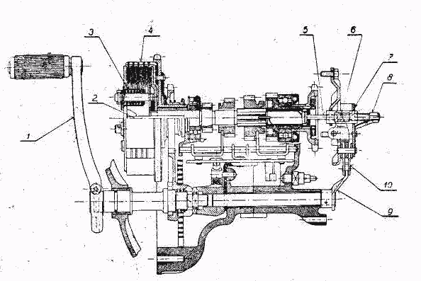Рис. 21 — Схема автоматического выключения сцепления 1. Рычаг механизма запуска и пе- 7. Несущая пластина механизма реключения передач выключения сцепления 2. Выключающий шток сцепления 8. Регулировочный винт механизма с упором автоматического выключения 3. Стакан 9. Кулачок автоматического вы- 4. Сцепление ключения 5. Выключающий шток сцепления 10. Выключающий рычаг 6. Шарик