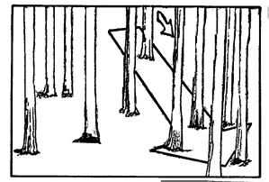 Рис. 4 После разработки волока выполняется прореживание на прилегающей к нему половине полупасеки (рис. 4 г). Валка деревьев производится в направлении вперед и назад так, чтобы они лежали как можно ближе к пачкам сортиментов, которые можно использовать для поддержания стволов на удобной высоте. Закончив прореживание на прилегающей к волоку половине полупасеки, приступают к разработке дальней ее половины. Деревья валят так, чтобы они падали по направлению к волоку и на сформированные пачки сортиментов (рис. 4 д). В аналогичной последовательности разрабатывается вторая полупасека, расположенная по другую сторону волока. Рубка рядами. Данный метод (рис. 5) рекомендуется при проведении сплошных рубок главного пользования на грунтах с удовлетворительной и хорошей способностью. В состав системы машин входит безредукторная бензиномоторная пила и форвардер. Допускается применение колесного трактора с прицепной тележкой и гидроманипулятором или сортиментовоза с гидроманипулятором. Радиус действия манипулятора должен быть не менее 6 м, грузовой момент – не менее 40 кН . м. Цель метода – свести ручную обрезку сучьев до минимума, обеспечивая ее на удобной рабочей высоте, оставляя в то же самое время пиловочник там, где он лежит, готовый к погрузке форвардером. Единственное ручное пакетирование, которое нужно сделать – отделить балансы (вершинную часть) от пиловочника. Преимуществом данного метода является также возможность создания толстого настила из веток и сучьев для передвижения форвардера. Ширина пасеки для данного метода зависит от средней высоты вырубаемых деревьев и не может превышать их двойную высоту. Разработка пасеки начинается с валки толстого ветвистого дерева, расположенного посередине пасеки, прямо на другие деревья (рис. 5 а). На нем обрезаются сучья и делаются поперечные надрезы в соответствии со схемой раскроя хлыстов на сортименты. Данное дерево будет служить опорной платформой для последующих деревьев. В зоне поваленного выбирается близстоящее дерево, которое валится на дерево-опору так, чтобы центр его тяжести находился близко к дереву-опоре (рис. 5 б). Для перемещения поваленного дерева на дереве-опоре в сбалансированное положение вальщик может использовать лом с кантовальным крюком. После обрезки сучьев и выполнения надрезов сбалансированный хлыст легко повернуть таким образом, чтобы он лег параллельно дереву-опоре (рис. 5 в). Если необходимо увеличить высоту " опоры", его оставляют лежать. В противном случае делаются поперечные распилы ствола в местах надрезов на сортименты. Далее продолжается направленная валка других деревьев поперек дерева-опоры (рис. 5 г), по такому же принципу, с двух полупасек. В первую очередь валятся близстоящие деревья, во вторую – отдаленные. После вырубки деревьев в зоне дерева-опоры выбирается новое крепкое дерево для опоры (рис. 5 д). Осуществляется смещение зоны работ к вновь поваленному дереву и обработанному дереву-опоре. На него аналогично валятся и обрабатываются вначале ближестоящие деревья (рис. 5 е), а затем деревья, находящиеся далеко от ряда сортиментов (рис. 5 е). Если некоторые деревья находятся слишком далеко, чтобы их переместить или легко опереть на ряд сортиментов, то их оставляют стоять до работы со следующим рядом (на новой пасеке). Завершаются работы попереч