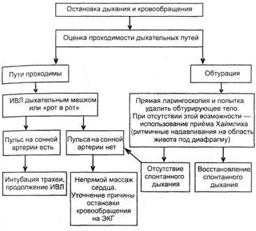 Рис. 2-1. Алгоритм сердечно-лёгочной реанимации. Специализированный реанимационный комплекс включает следующие мероприятия: • электрокардиография и дефибрилляция; • обеспечение венозного доступа и введение ЛС; • интубация трахеи.