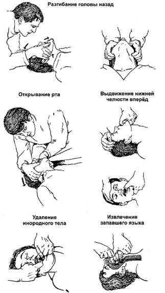 При обструкции дыхательных путей инородным телом пострадавшего укладывают на бок и производят 3-5 резких ударов нижней частью ладони в межлопаточной области, затем пальцем пытаются удалить инородное тело из ротоглотки. Если этот метод неэффективен, то выполняют приём Хаймлиха: ладонь оказывающего помощь лица укладывают на живот между пупком и мечевидным отростком, вторую руку помещают на первую и производят толчок снизу вверх по средней линии, а также пальцем пытаются удалить инородное тело из ротоглотки (рис. 2-3).
