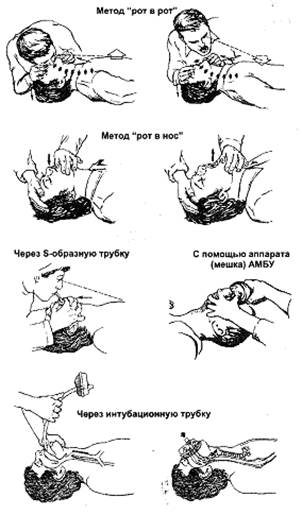 Искусственное дыхание — вдувание воздуха или обогащённой кислородом смеси газов в лёгкие пациента без или с применением специальных устройств. Выдыхаемый человеком воздух содержит 16—18% кислорода, поэтому эффективнее ИВЛ атмосферным воздухом, либо кислородо-воздушной смесью. Каждое вдувание должно продолжаться 1—2 с. Адекватность ИВЛ оценивают по периодическому расширению грудной клетки и пассивному выдыханию воздуха. Бригада СМП обычно проводит ИВЛ либо через воздуховод или лицевую маску, либо после интубации трахеи с помощью мешка Амбу.