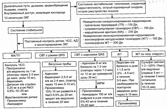 Рис. 3-21. Алгоритм действий при тахиаритмии. МА — мерцательная аритмия; ТП — трепетание предсердий; СВТ суправентрикулярная тахикардия; ЖТ — желудочковая тахикардия.