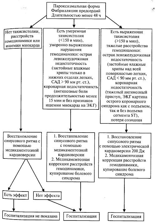 Рис. 3-22. Алгоритм действий на догоспитальном этапе при пароксизмальной форме фибрилляции предсердий длительностью менее 48 часов