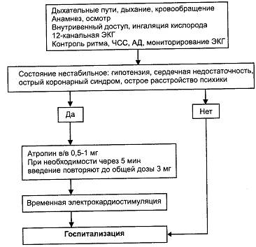 Госпитализация показана при остро возникшей брадиаритмии с ЧСС менее 40 ударов в минуту, наличии приступов Морганьи-Адамса-Стокса или синкопальных состояний. При нестабильной гемодинамике проводят экстренную госпитализацию в реанимационное отделение. В госпитализации не нуждаются пациенты с физиологической брадикардией (спортсмены), при удовлетворительной гемодинамике и отсутствии синкопальных состояний на фоне передозировки ЛС у больных с хроническими заболеваниями вне обострения (рекомендуется обратиться к участковому врачу для коррекции лечения).