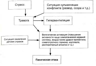 В основе вегетативного криза лежит дисфункция гипоталамо-лимбико-ретикулярного комплекса. Причины, провоцирующие панические атаки: • психогенные — острые и хронические стрессы, в частности смерть близких, болезнь, развод, неприятности на работе и т.д.; • дисгормональные — беременность, аборт, климакс, начало половой жизни, менструальный цикл и т.д.; • физические и химические — чрезмерные физические нагрузки, переутомление, алкогольные эксцессы, метеотропные факторы, гиперинсоляция и т.д. Патогенез панических атак включает в себя биологические и психогенные факторы (рис. 5-8).