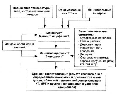 Рис. 5-9. Алгоритм диагностики менингитов, менингоэнцефалитов, энцефалитов на догоспитальном этапе.