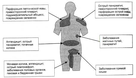 • Заболевания органов вне полости живота (инфаркт миокарда, пневмония, плеврит, перикардит, пиелонефрит и паранефрит). • Болезни органов малого таза (см. статью «Острый живот в гинекологии»). • Заболевания опорно-двигательного аппарата и нервной системы, приводящие к поражению чувствительных нервов (деформирующий спондилёз, каузалгия, сирингомиелия, сухотка спинного мозга, психогения).