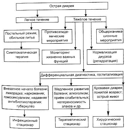 Рис. 11-7. Неотложная помощь при острой диарее. При тяжёлой диарее или неудовлетворительном состоянии больного первая помощь предполагает неотложную фармакотерапию интоксикации гипотонии, полноценную догоспитальную регидратацию пациента в следующей последовательности (рис. 11-8).