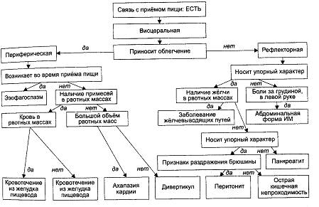 Рвоту следует отличать от срыгивания, которое относится к выбросу пищи без тошноты и сокращения мышц брюшной стенки и диафрагмы. Срыгивание содержимого пищевода может происходить при стриктуре пищевода или его дивертикуле. Срыгивание содержимого желудка наблюдают при недостаточности желудочно-пищеводного сфинктера, особенно при наличии грыжи пищеводного отверстия диафрагмы или в сочетании с пептической язвой, в случае развития пилороспазма. Рвоту, развивающуюся по утрам, наблюдают в ранние сроки беременности, при уремии, алкогольном гастрите (сухая рвота). Рвота вскоре после приёма пищи характерна для пилороспазма или гастрита. Рвота, возникающая через 4—6 ч после приёма пищи и сопровождающаяся выбросом большого количества непереваренной пищи, указывает на задержку пиши в желудке (при диабетической атонии желудка или непроходимости привратника). Гнилостный запах рвотных масс наблюдают при непроходимости в нижних отделах кишечника, перитоните, или при наличии желудочно-кишечного свища. При длительной рвоте в содержимом желудка часто присутствует желчь. Это не имеет значения, если только жёлчь не обнаруживают постоянно в большом количестве в рвотных массах. Это может указывать на непроходимость, локализованную ниже печёночно-поджелудочной ампулы. Наличие крови в содержимом желудка означает кровотечение из пищевода, желудка. Дифференциальная диагностика рвоты в зависимости от приёма пищи представлена на рис. 11-10 и 11-11.