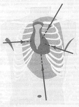 Рис. 13-14. Схема «опасной области» грудной клетки, в пределах которой возможны ранения сердца (по В.И. Бураковскому, Л.А. Бокерия, 1989) 2. Помимо раны в проекции сердца, боли, наличия акта свершившейся травмы, в анамнезе пострадавших может иметь место кратковременная или более длительная потеря сознания (обморок, спутанное сознание). При ранениях сердца нередко встречается признак, описанный Н.И. Пироговым, — кратковременный обморок сразу после ранения и стойкое чувство страха. «Старые» врачи считали, что при возможном поражении передне-перегородочной области (при инфаркте, ранении) боли иррадиируют в обе верхние конечности. При этом субъективные признаки ранения сердца, обнаруживающиеся при осмотре, весьма разнообразны и во многом зависят от индивидуальности пострадавшего. Чаще преобладают резкая слабость (не всегда), боль в области сердца, «чувство страха» (признак Вольфа), «боязливое выражение лица» (Bircher), «предсердечная тоска» (Лизанти) и др. Однако эти признаки не являются патогномоничными. 3. При осмотре виден также цианоз, кожа бледная, холодный липкий пот. Выявляют и другие объективные признаки наличия ранения сердца. o Иногда можно наблюдать выраженное в различной степени затруднение дыхания (ЧДД 30-40 в минуту). o Границы сердца (их определению могут мешать подкожная эмфизема, гемо- и пневмоторакс) увеличены. o Сердечный толчок. Ослабление сердечной деятельности, наличие крови в перикарде и средостении, пневмоторакс и подкожная эмфизема делают его невидимым и неощутимым. o Тоны сердца глухие, едва слышны, а в ряде случаев не выслушиваются. o Патологические шумы «шум артериальной аневризмы» (Lisanti), «журчащий шум» (Noll), «скребущий шум» (А. Окиншевич), «шум мельничного колеса» (Morel-Lavalle) и др. могут быть, но не являются патогномоничными для ранения сердца. o Пульс частый, малого наполнения. 4. Клинические проявления ранений сердца определяются главным образом тремя позициями: наличием признаков тампонады, кровопотери и шока.