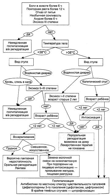 — препараты выбора — цефтриаксон или фторхинолоны (у детей старше 12 лет; — при поражении ЦНС — глюкокортикоиды. Алгоритм оценки больного ребёнка приведён на рис. 17-3.