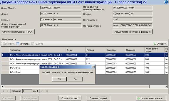 Рисунок 86 – Создание версии Акта инвентаризации ФСМ Нажмите на кнопку Подтвердите создание версии Акта инвентаризации, нажав на кнопку «Yes» в отобразившемся на экране сообщении. Сформируется новая версия Акта инвентаризации в статусе «Создано» и откроется форма его свойств. Информация в новой версии Акта будет полностью повторять данные предыдущего (отказанного) акта. Свойства и позиции акта будут доступны для редактирования. Также возможно удаление и добавление новых позиций (см. пункт 6.3.1). Если редактирование Акта полностью завершено, создайте Отчет об использовании, который будет привязан к данной версии Акта. Для этого нажмите на кнопку Теперь новая версия Акта и Отчет могут быть отправлены в МРУ (см. пункт 6.3.3).