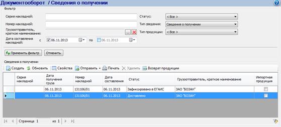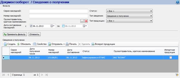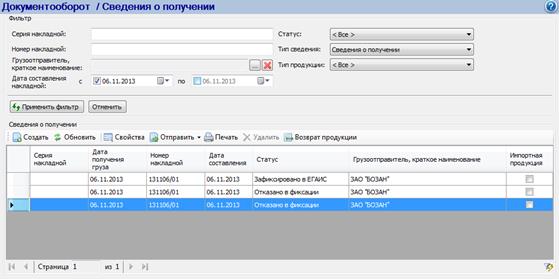 Рис 118д– Сведение о получении. Список версий документа. Запрещено создание версий для документов, которые были отклонены в МРУ (был установлен статус «Отказано в фиксации»). Для того чтобы внести корректировку в документ такого вида (который уже получил отказ фиксации) необходимо выбрать версию документа в статусе «Зафиксировано в ЕГАИС» и повторно создать для него версию документа (п.п 6.5.9.1). В списке появится также вторая версия документа в статусе «Создано». Таким образом для просмотра доступно три версии документа: первоначальная (нулевая) в статусе «Зафиксировано в ЕГАИС», первая версия – с отказом фиксации и вторая версия, которая до отправки в МРУ будет находится в статусе «Создано» (рисунок 118е).