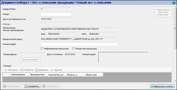 Рисунок 127 – Форма создания акта списания фасованной продукции Cохраните введенные данные. Нажмите на кнопку Примечание. При сохранении выполняется проверка на уникальность связки значений полей «Номер акта», «Дата», а также типа документа и позиции (фасованная / нефасованная продукция). Если документ с такими же значениями указанных полей существует в системе, отобразится соответствующее сообщение и документ не будет сохранен. При успешном сохранении сформируется значение поля «Номер ЕГАИС», в поле «Статус» отобразится значение «Создано». Затем необходимо ввести позиции документа. Нажмите на кнопку