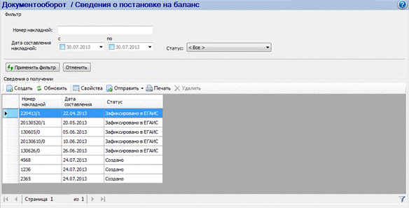 Рисунок 132 – Сведения о постановке на баланс Для поиска документов воспользуйтесь фильтром по следующим параметрам: · Дата составления накладной. Установите флаг для активации поля. Введите значение вручную или при помощи выпадающего календаря. · Номер накладной. Введите значение при помощи выпадающего списка. · Статус. Введите значение при помощи выпадающего списка. После того как параметры фильтрации определены, нажмите на кнопку