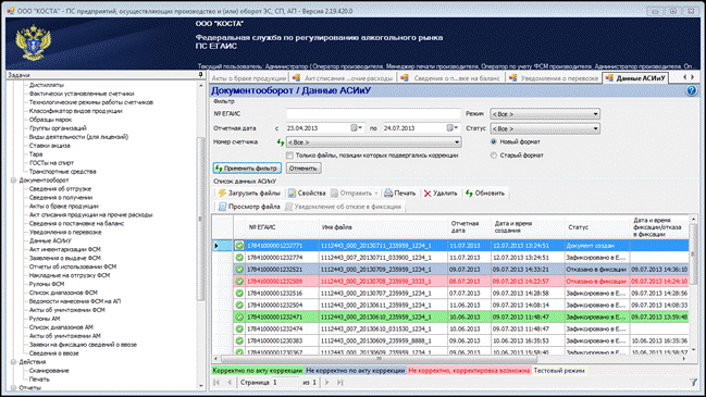 6.9 Документооборот / Данные АСИиУ Организации - производители ЭС, АП и ССП фиксируют в системе данные о количестве произведенной продукции, полученные от автоматических средств измерения и учета концентрации безводного спирта (АСИиУ). В ЕГАИС через АСИиУ проходит только та продукция, которую получает производитель, и та, которая производится и отгружается. Если виноматериал используется как промежуточный продукт, то он не должен учитываться средствами измерения. Продукция, которая фиксируется средствами АСИиУ, регистрируется в системе автоматически после фиксации соответствующих файлов АСИиУ. Для работы с файлами, полученными от АСИиУ, необходимо выбрать пункты меню Документооборот ® Данные АСИиУ (рисунок Рисунок 139).