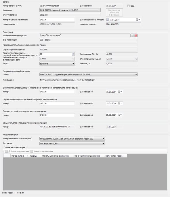 При необходимости существует возможность создания Заявки на фиксацию сведений о ввозе для другой продукции, которая соответствует полученному рулону АМ. В таком случае марки из этого рулона, которые были ранее включены в Заявку на фиксацию сведений о ввозе и находящейся в статусе «Создано» / «Зафиксировано в ЕГАИС» доступны не будут, а выбор диапазонов АМ будет осуществляется из оставшихся в рулоне марок.