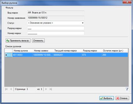 Выберите рулон из списка и нажмите на кнопку Выбрать. Диапазоны рулона добавятся в список диапазонов Заявки на ввоз. Из рулона будет взято количество марок, требуемое в Заявке; если марок в рулоне недостаточно – добавятся все доступные в нем марки. В этом случае нажмите кнопку Добавить диапазоны еще раз и выберите из списка другой из имеющихся рулонов. После завершения создания Заявки нажмите на кнопку Сохранить. Для возврата к списку Заявок нажмите кнопку