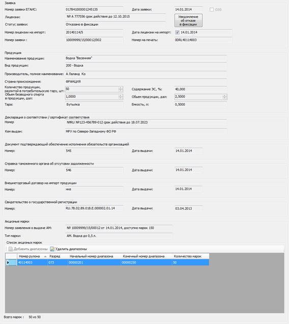 Рис 192а – Заявка на фиксацию сведений о ввозе в статусе «Отказано в фиксации». После удаления диапазонов АМ в отказанной в фиксации заявки они вновь будут доступны для выбора при создании новой Заявки на фиксацию сведений о ввозе. На основе зафиксированных в ЕГАИС «Заявки на фиксацию сведений о ввозе» автоматически создаются позиции плана печати АМ (см. подраздел 6.23).