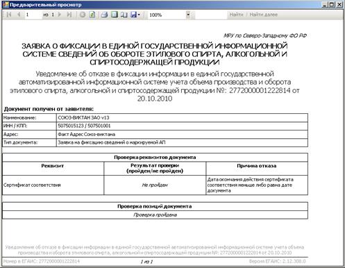 Рисунок 195 - Форма для ввода данных Заявки на фиксацию сведений о ввозе ЭС Введите данные: · Лицензии. Выберите действующую лицензию из выпадающего списка. · Наименование продукции. Данное поле является обязательным для заполнения. Для ввода значения воспользуйтесь формой выбора этилового спирта (рисунок 29). После заполнения данного поля автоматически заполняются поля «Вид продукции», «Содержание ЭС, %». · Производитель, полное наименование. Данное поле является обязательным для заполнения. Для ввода значения воспользуйтесь формой выбора иностранной организации, описание которой приведено в подпункте 6.1.6.4. После заполнения поля автоматически установится значение поля «Страна происхождения». · Объем продукции, дал. Данное поле является обязательным для заполнения. После его заполнения автоматически устанавливается значение поля «Объем безводного спирта в продукции, дал». · Номер и дата выдачи внешнеторгового договора на импорт продукции. Данные поля являются обязательными для заполнения. После ввода данных нажмите на кнопку Сохранить. Для возврата к списку заявок нажмите кнопку 6.21.5 Просмотр документа «Заявка на фиксацию сведений о ввозе» Для просмотра свойств заявки на фиксацию сведений о ввозе, выберите из списка требуемый документ и нажмите на кнопку Свойства. Откроется форма свойств Заявки. Для документов, которые были отклонены в УТО или прошли форматно-логический контроль с ошибками (статус «Отказано в фиксации»), можно просмотреть Уведомление об отказе в фиксации (с результатами проверки). Для того чтобы просмотреть полученное от УТО Уведомление, необходимо нажать на кнопку Уведомление об отказе в фиксации. Документ откроется для предварительного просмотра и дальнейшей печати (рисунок 196). Примечание. Номер документа в ЕГАИС отображается внизу на каждом листе печатной формы документа.