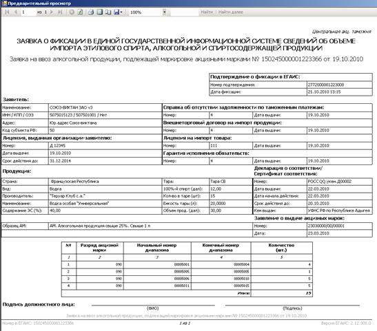 Рисунок 197 – Печатная форма Заявки на фиксацию сведений о ввозе В поле «Подпись должностного лица» печатной формы «Заявки на фиксацию сведений о ввозе» подпись должен ставить руководитель предприятия. Номер документа в ЕГАИС отображается внизу на каждом листе печатной формы документа.
