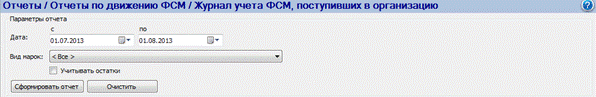 Рисунок 241 - Форма создания отчета Журнал учета ФСМ, поступивших в организацию Нажмите на кнопку