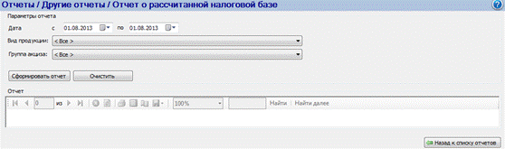 Рисунок 250 - Форма создания отчета о рассчитанной налоговой базе Для формирования отчета необходимо ввести следующие параметры: · Дата (с...по). Задайте начальную и конечную дату временного диапазона, за который формируется отчет. Для ввода значений воспользуйтесь календарем. По умолчанию задана текущая дата. · Вид продукции. Задайте наименование продукции в соответствии с классификатором видов продукции. Выберите значение из выпадающего списка, в котором содержатся данные справочника видов продукции. Если параметр не задан, то отчет формируется по всем видам продукции. · Группа акциза. Задайте группу подакцизной продукции, по которой должен формироваться документ. Выберите значение из выпадающего списка, в котором содержатся данные справочника ставок акциза. Если параметр не задан, то отчет формируется по всем группам подакцизной продукции. Нажмите на кнопку