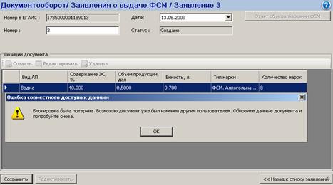 Рисунок 266 – Сообщение о потере блокировки В этом случае необходимо вернуться к списку документов и повторить попытку редактирования. 2) При попытке пользователем работать с документом, который был заблокирован другим пользователем (например, попытка отправки) на форме со списком документов будет показано предупреждающее сообщение: Документ был заблокирован пользователем < Имя пользователя>. Попробуйте снова, когда блокировка будет снята. В данном случае пользователю следует дождаться снятия блокировки. 3) Если пользователь открыл на редактирование выбранный документ, но документ заблокирован другим пользователем), ввод и сохранение изменений в документ будут невозможны. На форме свойств будет показано сообщение: Документ был заблокирован пользователем < Имя пользователя>. Попробуйте снова, когда блокировка будет снята. В данном случае следует дождаться снятия блокировки. Если документ заблокирован долгое время, то следует обратиться к администратору системы. 4) Если пользователь взял на редактирование неактуальный документ, не обновив предварительно список данных, то дальнейшая работа с неактуальным документом будет невозможна. Пользователю будет показано предупреждающее сообщение: Документ был изменен пользователем < Имя пользователя>. Обновите данные документа и попробуйте снова. Необходимо обновить список данных, затем продолжить работу с документом.