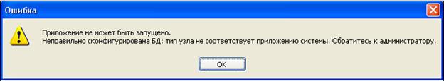 При возникновении ошибок системно-технического характера Вы будете проинформированы предупреждающими сообщениями. 1) Ошибка запуска приложения. При запуске Приложения может быть показано предупреждающее сообщение «Приложение не может быть запущено», связанное с неправильной конфигурацией базы данных при установке.