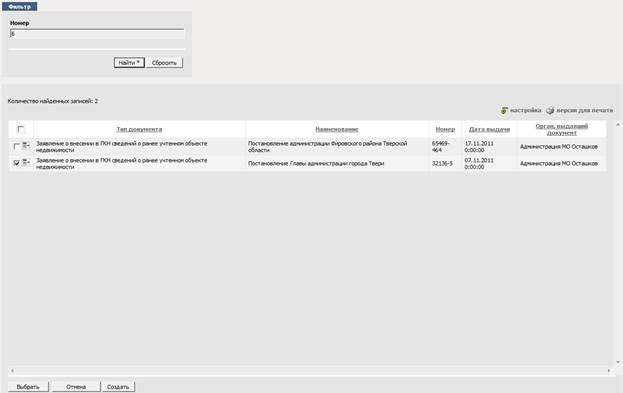Для того, чтобы выбрать документ надо поставить галочку слева от нужного документа и нажать на кнопку «Выбрать»: