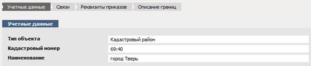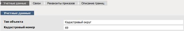 На закладке Учетные данные отображаются основные учетные сведения. Для КК – кадастровый номер, ОКАТО, ОКТМО.