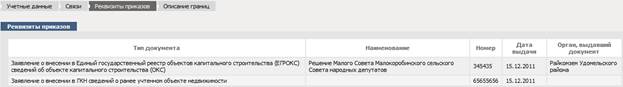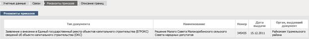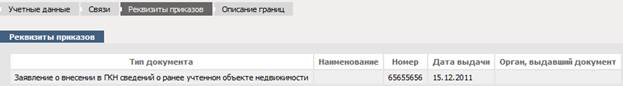 На закладке Реквизиты приказов отображаются сведения о документах, на основании которых были внесены сведения о кадастровом делении.