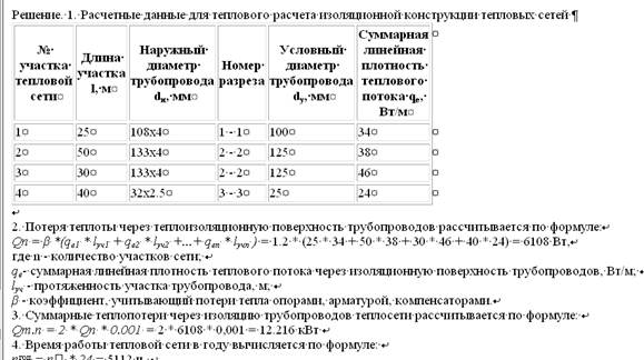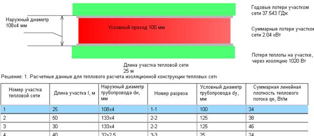 После определения параметров тепловой сети нажимается кнопка «Расчет». Программа рассчитывает следующие параметры для каждого участка тепловой сети: суммарную линейную плотность теплового потока (Вт/м); годовые потери участком сети (ГДж); суммарные потери участка сети (кВт); потери теплоты на участке через изоляцию (Вт). Результаты расчетов представлены на рисунке Б.3.