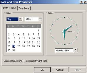 Рисунок 3 – Настройка даты и времени 1. Убедитесь, что выбран часовой пояс данного региона (GMT +_). 2. Убедитесь, что текущее время точное для данного региона с погрешностью не более 4х минут. Обратите внимание, что компьютеры, входящие в домен, по умолчанию производят синхронизацию времени в соответствии с иерархией домена. То есть используют в качестве источника времени контроллер домена, проверяющий их подлинность. Все контроллеры домена используют в качестве источника времени хозяина операций основного контроллера домена (PDC). В этом случае настройку системного времени рекомендуется производить в следующем порядке: 1. Настроить синхронизацию системного времени основного контроллера домена с сервером точного времени. Необходимо наличие прав администратора. Рекомендуется настроить надежную службу времени в корневом домене либо вручную настроить PDC для синхронизации с внешним источником времени. 2. Убедиться, что выполняется автоматическая синхронизация системного времени узла, входящего в домен, с системным временем контроллера домена. Для синхронизации системного времени узла, входящего в домен, с системным временем контроллера домена вручную, можно использовать команду w32tm /resync (выполняется в командной строке).