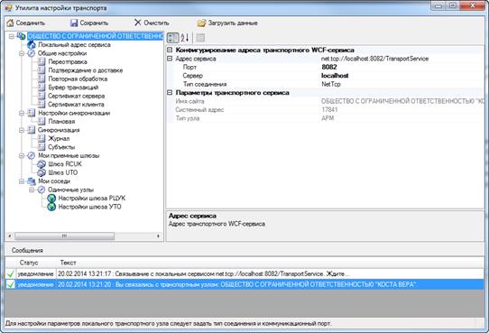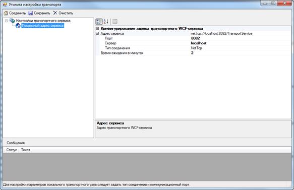 Рисунок 16 – Главное окно утилиты настройки транспорта На сером фоне в нижней части страницы отображаются подсказки по настройке параметров. Первоначально необходимо выполнить конфигурирование транспортного сервиса ПС Организаций. Адрес сервиса не редактируется. Укажите номер порта транспортного сервиса ПС Организаций в поле «Порт» и тип соединения. Как правило, указывается Net Tcp. Сохраните настройки. Выполните соединение. Нажмите на кнопку «Соединить». В случае если неправильно указаны параметры соединения, или не был запущен транспортный сервис, появится сообщение о невозможности связаться с транспортным сервисом. Тогда необходимо проверить, действительно ли запустился сервис. И запустить, как описано в разделе «Запуск системы». А также правильно указать адрес транспортного сервиса. После чего повторно запустите соединение. В результате будет показано сообщение о том, что соединение выполнено успешно (рисунок Рисунок 17), а также отобразится полный список возможных настроек транспортного сервиса ПС Организаций для соединения с МРУ и УТО. Системный адрес – уникальный адрес ЕГАИС узла, однозначно идентифицирующий узел (организацию) в системе ЕГАИС.