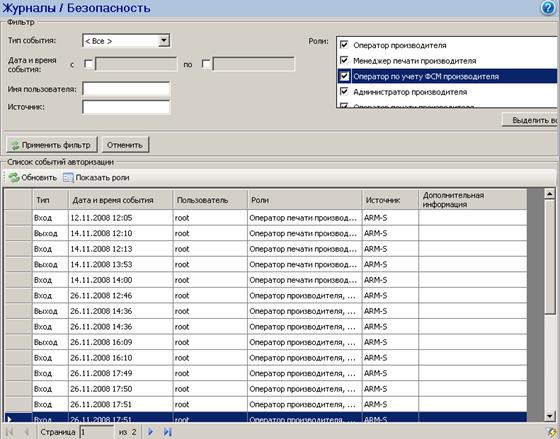 Рисунок 46 – Страница аудита безопасности ПС Организаций В верхней части страницы находится фильтр. Укажите необходимые параметры: · Дата и время события (с…по). Задайте период, в течение которого могло произойти событие. Чтобы выбрать определенную дату события, установите флаг и воспользуйтесь выпадающим календарем. Также вы можете задать промежуток времени, в течение которого могло произойти событие. В результате в списке отобразятся события, произошедшие в заданный промежуток времени. · Тип события. Возможные варианты: o Все. o Вход. Пользователя вошел в систему. o Выход. Пользователь вышел из системы. o Ошибка. При попытке запуска ПС Пользователем произошла ошибка. · Роль пользователя. Отметьте флагом необходимые роли пользователя. Для того чтобы отметить все роли, нажмите на кнопку «Выделить все». · Имя пользователя. · Источник. Укажите рабочую станцию пользователя. Нажмите на кнопку «Применить фильтр». В списке отобразятся события по заданным параметрам фильтрации. Также вы можете ознакомиться с ролями пользователя. Для этого выберите запись журнала и нажмите на кнопку